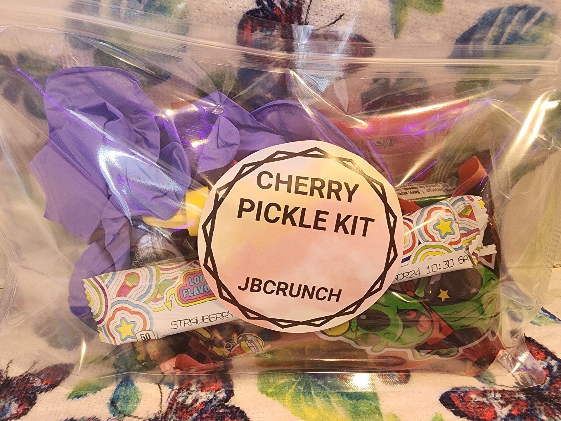 Comes with gloves, cherry pickle, different Mexican candy's, fruit roll up