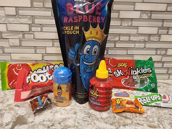 Comes with gloves, blue raspberry pickle, Mexican candy's, fruit roll up, blue takis